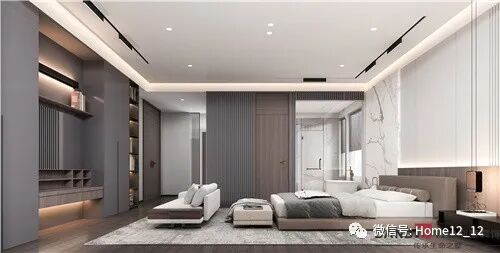 卧室空间采用了大面积的暖灰与暖棕色,营造温馨感。定制柜体的设计满足收纳的多样性的同时保持空间的规整感。床尾凳与沙发打造休闲性。