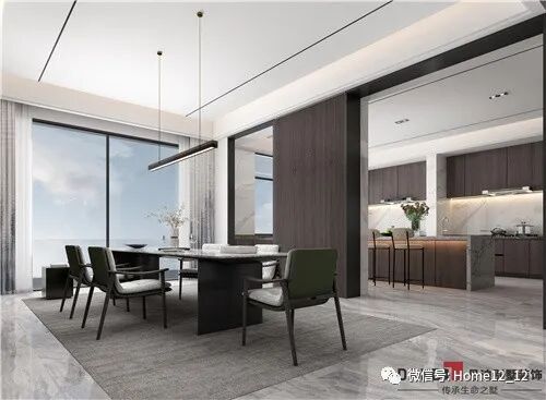 就餐区与开放式厨房以木饰面墙体隔开,但空间上流动相通,具有统一性。大面积的落地窗满足就餐时的观景需求,增加了视野开阔感。灰色地毯与灰白地面铺装使空间明亮整洁。