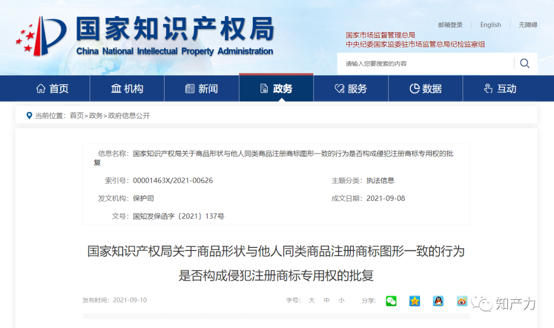 近日,国家知识产权局官网,发布了一则关于商品形状与他人同类商品注册商标图形一致的行为是否构成侵犯注册商标专用权的批复。