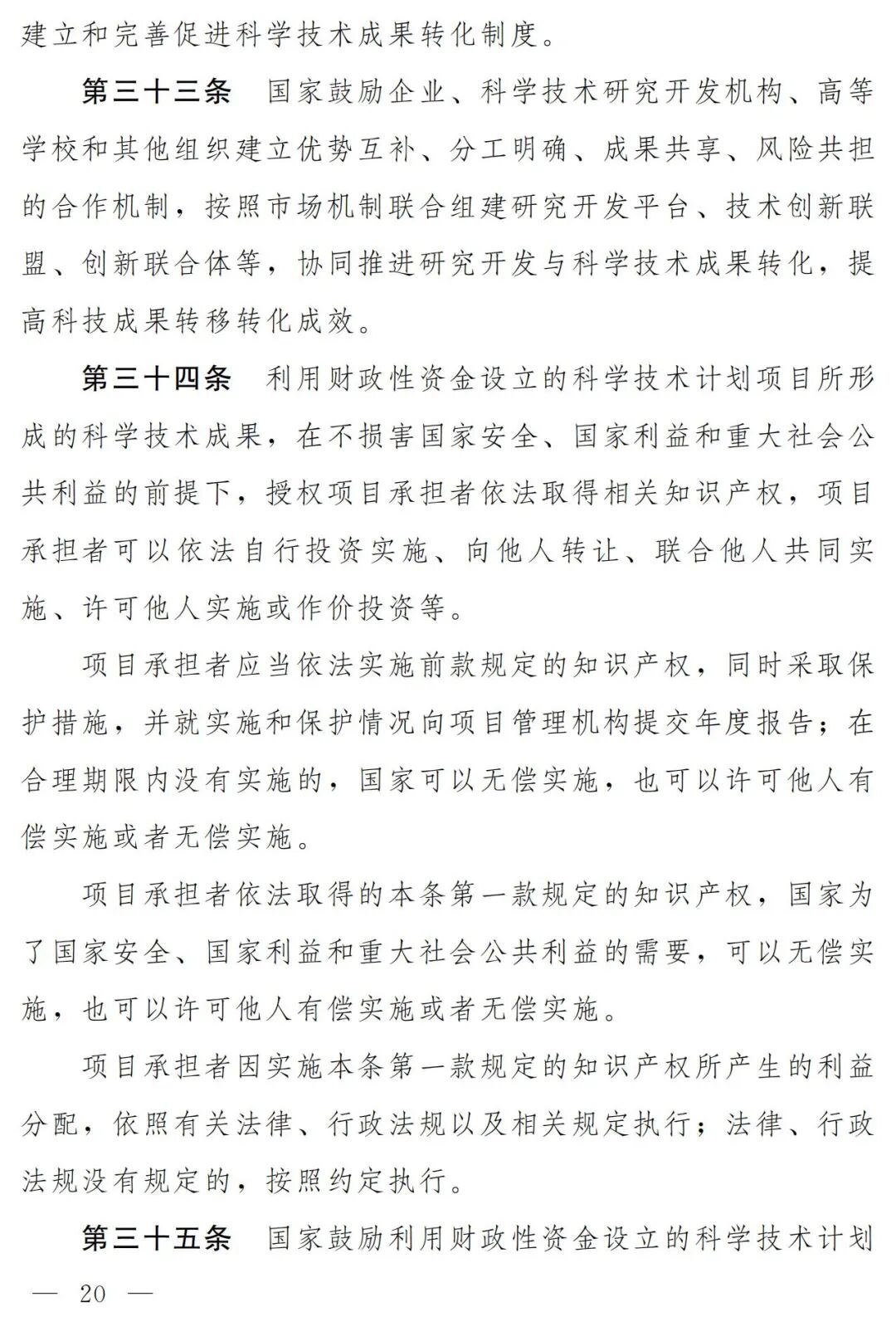 第三十四条利用财政性资金设立的科学技术计划项目所形成的科学技术成果,在不损害国家安全、国家利益和重大社会公共利益的前提下,授权项目承担者依法取得相关知识产权,项目承担者可以依法自行投资实施、向他人转让、联合他人共同实施、许可他人实施或作价投资等。