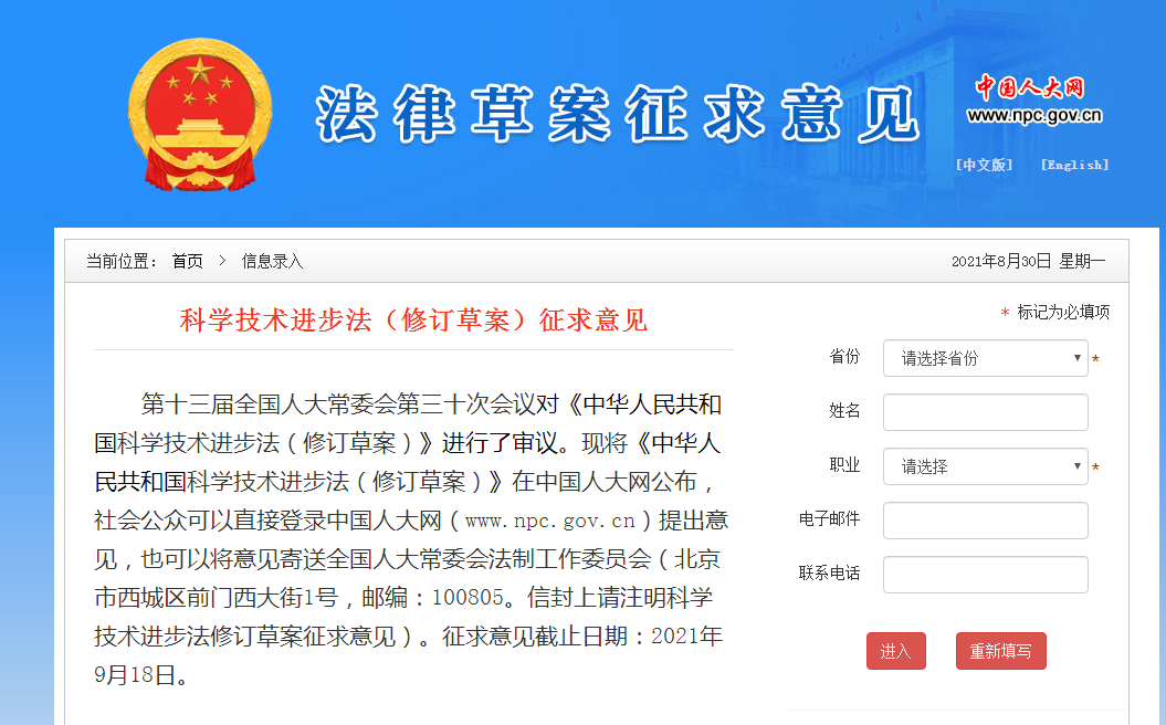 IPRdaily消息:近日,中国人大网发布了《中华人民共和国科学技术进步法(修订草案)》,社会公众可以直接登录中国人大网(www.npc.gov.cn)提出意见。征求意见截止日期:2021年9月18日。