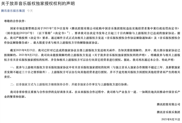 2021年8月31日晚,腾讯发布《关于放弃音乐版权独家授权权利的声明》。声明称,公司严格按照此前国家市场监管总局发布的《腾讯控股有限公司收购中国音乐集团股权违法实施经营者集中案行政处罚决定书》要求,通过邮件方式正式向相关上游版权方发送《音乐版权授权合作协议解除通知函》及《音乐版权授权合作协议解除催告函》,最大限度寻求与相关上游版权方尽快解除独家协议。