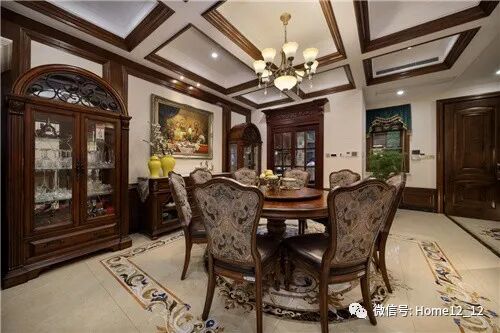 原有入户门与公卫的改动,让餐厅空间更加独立完整。整体用材与客厅呼应统一。以棕色系和米色系搭配为主,餐厅整体庄重典雅、低奢内敛,散发出品质与贵气。