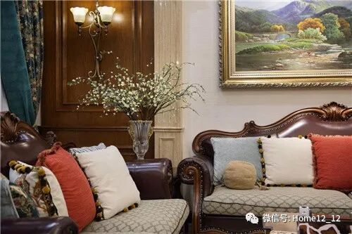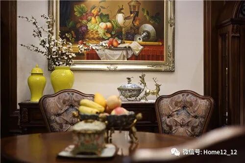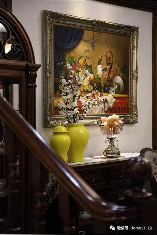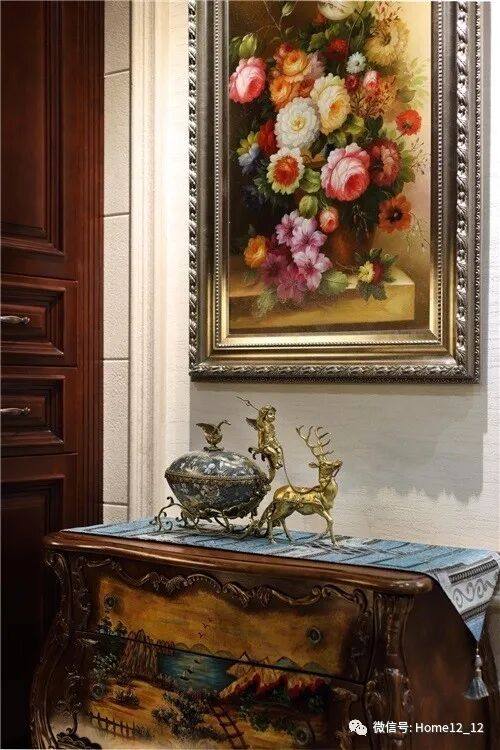 雕刻了植物花叶图案的玄关桌以喷绘式风景油画赋予空间浓厚的历史故事感,热情活泼的五彩挂画让空间洋溢着欢乐气息,精致雕琢的趣味器皿给空间平添了几分活力。