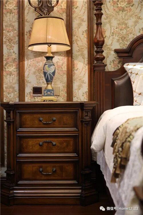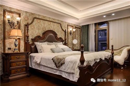具有光滑弧形线条的床架、轻快浅色花纹壁纸图案、黄铜质感花垫子妆凳营造柔和静谧的空间氛围的同时彰显公主般的尊贵感。