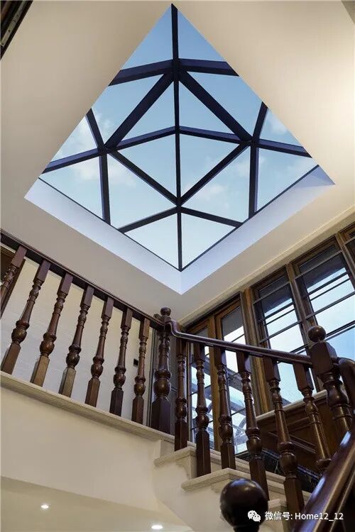 作为连结各个功能空间的过道区域,保持室内设计风格的统一性尤为重要。基于别墅采光及楼梯布局的不足,改造后设计了U型楼梯与屋顶的金字塔阳光顶,解决问题的同时使空间具有了灵性与神秘气息。