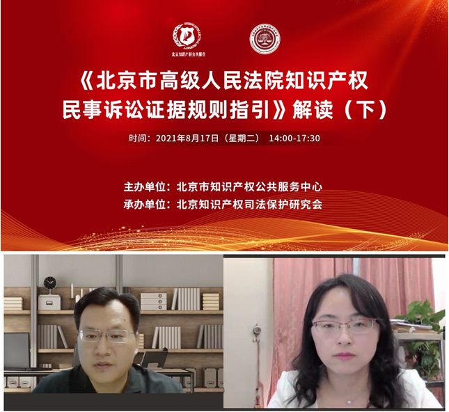8月17日,市知识产权公共服务中心(简称公共服务中心)举办了《北京市高级人民法院知识产权民事诉讼证据规则指引》解读(下)培训。北京市企事业单位、科研院所、法律实务及产业界代表 400余人通过线上方式参加。