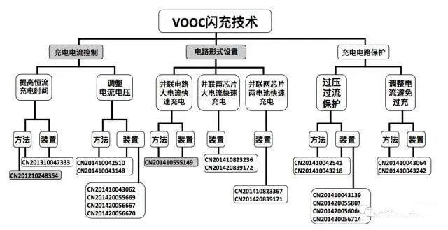 图2所示为OPPO在VOOC闪充技术方面截止2016年3月公开的专利分布情况,分别涉及闪充技术的充电电流控制、电路形式设置以及充电电路保护等技术分支。