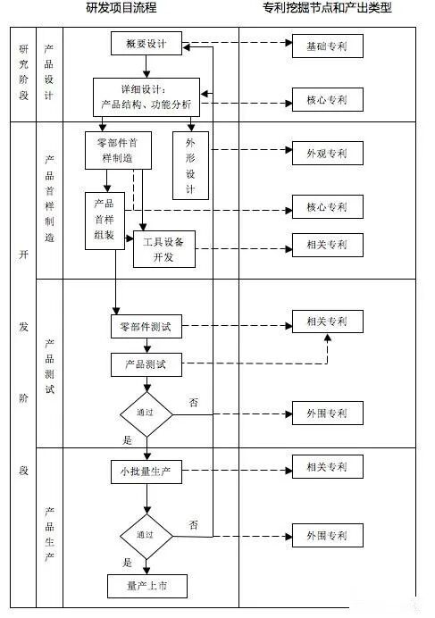 (2)贯穿研发项目始终。由于企业研发项目具有系统性的特点,在其所涉及的每一个环节、每一个方面都应该是基于研发项目的专利挖掘手段应当关注的重点。贯穿研发项目始终的专利挖掘节点和专利产出类型如图1所示。