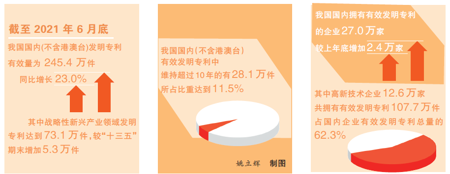 另一方面则是发明专利维持时间更长。数据显示,我国国内有效发明专利中,维持超过10年的有28.1万件,所占比重达到11.5%,较“十三五”末提高0.2个百分点。“我国有效发明专利维持年限结构持续优化。”国家知识产权局战略规划司司长葛树在新闻发布会上这样解读。