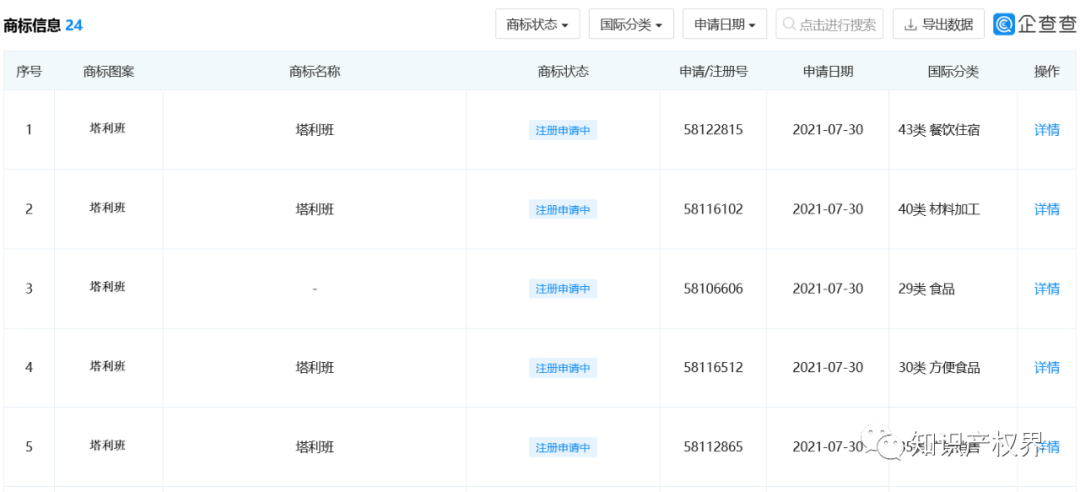 据企查查信息显示,佛山一公司实际上申请了5件“塔利班”商标,其中一件商标图片为塔利班,商标名称空白,该公司申请的5件商标分别为第43类餐饮住宿,第40类材料加工,第29类食品,第30类方便食品以及第35类广告销售。