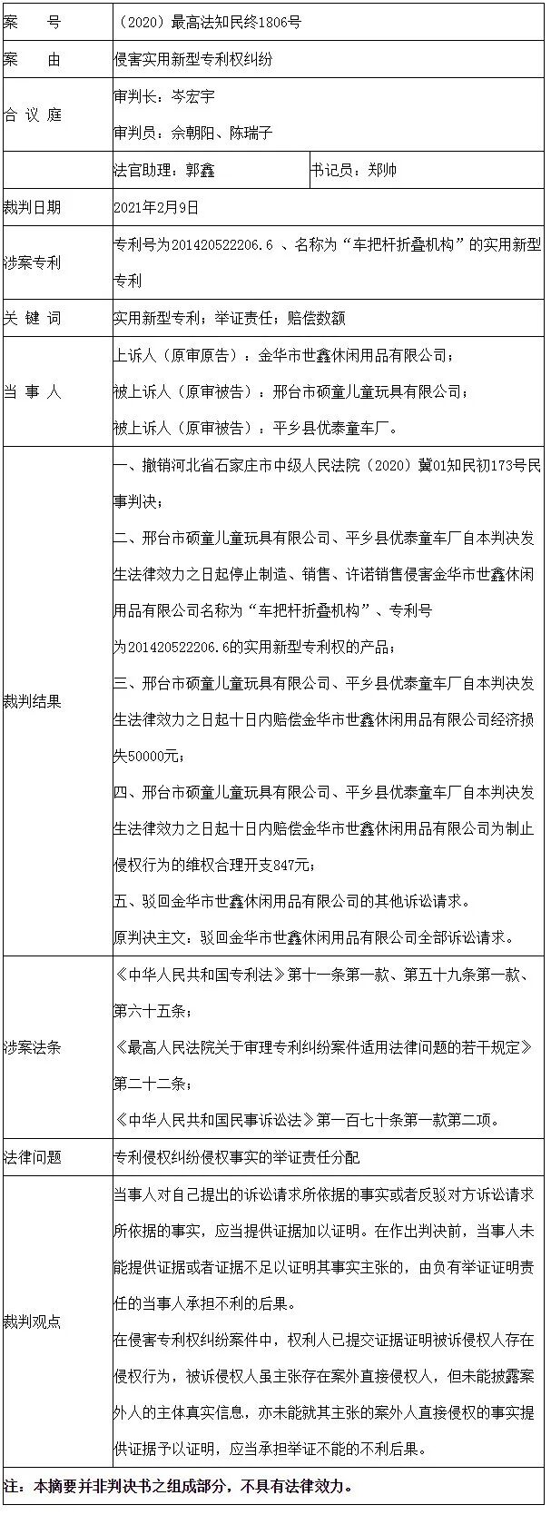 上诉人金华市世鑫休闲用品有限公司(原名东阳市天鑫休闲用品有限公司,以下简称世鑫公司)因与被上诉人邢台市硕童儿童玩具有限公司(以下简称硕童公司)、平乡县优泰童车厂(以下简称优泰童车厂)侵害实用新型专利权纠纷一案,不服河北省石家庄市中级人民法院于2020年7月28日作出的(2020)冀01知民初173号民事判决,向本院提出上诉。本院于2020年11月16日立案后,依法组成合议庭进行了审理。本案现已审理终结。