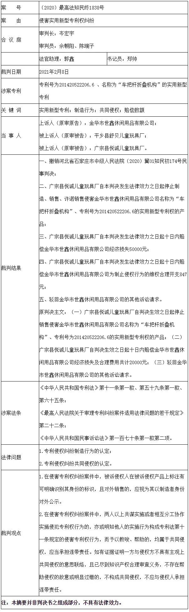 上诉人金华市世鑫休闲用品有限公司(原名东阳市天鑫休闲用品有限公司,以下简称世鑫公司)因与被上诉人平乡县舒贝儿童玩具厂(以下简称舒贝玩具厂)、广宗县悦诚儿童玩具厂(以下简称悦诚玩具厂)侵害实用新型专利权纠纷一案,不服河北省石家庄市中级人民法院于2020年7月28日作出的(2020)冀01知民初174号民事判决,向本院提出上诉。