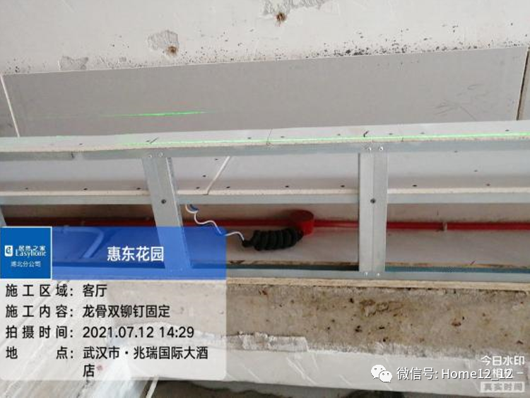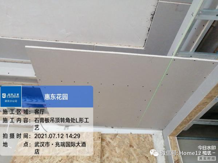 在吊顶施工中,吊顶拐角处居然装饰并不使用常见的两块板的拼接工艺,而是全部采用L形石膏板进行施工,最大程度的防止开裂问题。在龙骨与龙骨之间,居然装饰全部使用双铆钉进行固定,更好的保持了龙骨之间的水平距离,增加龙骨的安全性,而在边龙骨处,也全部使用膨胀螺丝进行固定,使吊顶更加稳固。