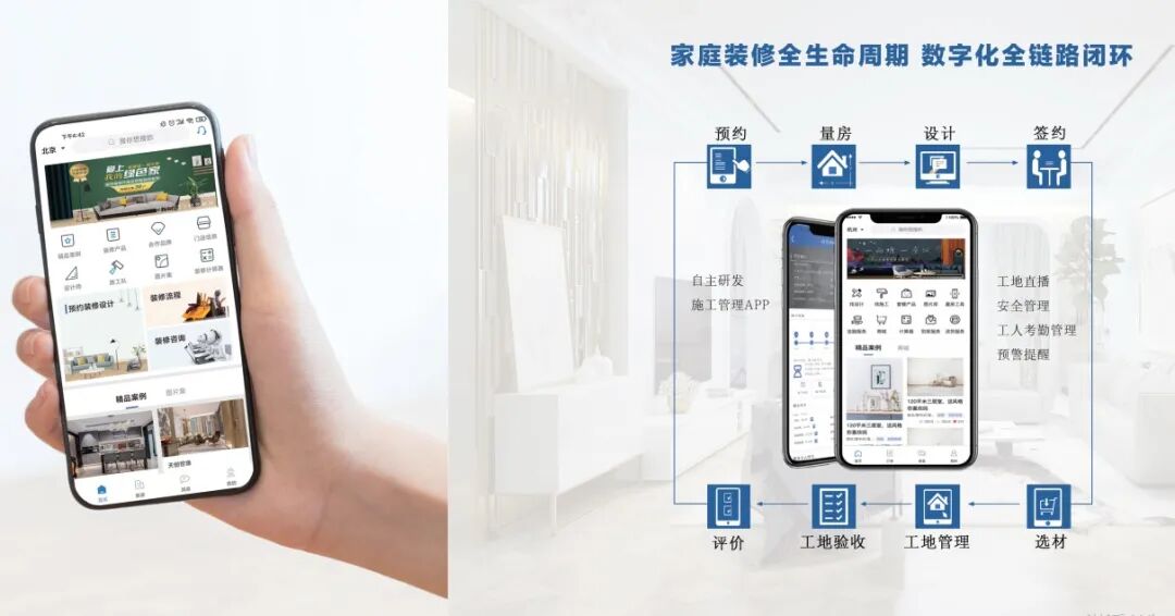 为实现从设计到材料、从施工到售后家装全链路的数字化管理,居然装饰自主研发了施工管理APP,为业主、设计师和材料商提供免费专业工具和定制服务,提供完整装修方案,实现了家居装修全流程的线上化。在线施工平台汇聚了本地优秀的施工班组,以线上平台为载体,为客户提供预约、咨询、量房、设计、签约、选材、工地管理、监理、工地验收、评价等装修全生命周期服务。例如通过“人脸识别”等技术手段,在移动端设备上实现工地实况直播、安全管理、工人考勤管理、预警提醒等功能,使整个装修流程在线化、透明化、可视化,避免施工队偷工减料、以次充好。