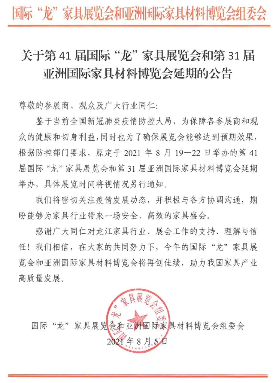 ➓2021中国跨境电商交易会(秋季)展会延期的具体内容如下: 一、展会延期信息 1 2021东莞国际设计周 原定于2021年8月18日-21日举行的2021东莞国际设计周高端定制设计选材展暨第46届国际名家具(东莞)展览会、2021中国(广东)国际家具机械及材料展(秋季)延期举办。新展期暂未公布。 2 第41届国际“龙”家具展览会