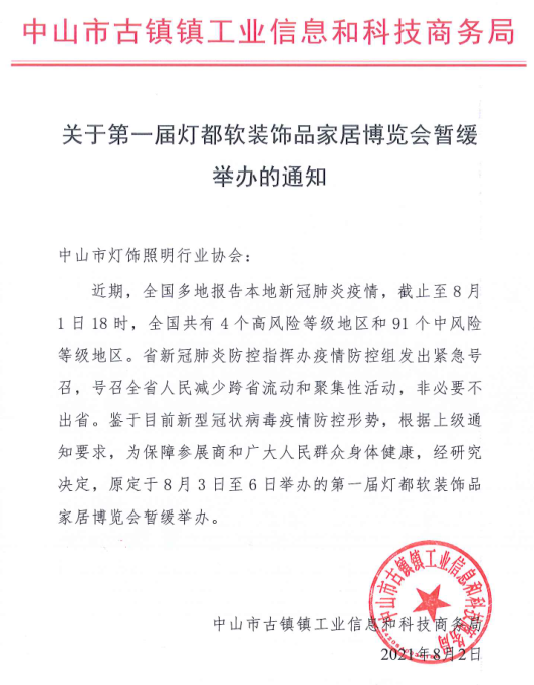 及舒适家居系统博览会原定于2021年8月16日至18日在中国进出口商品交易会展馆(广交会展馆)A区举办的“2021亚洲热能科技及舒适家居系统博览会”将延期举办,具体恢复举办时间和地点另行通知。 9 第一届灯都软装饰品家居博览会 鉴于目前新型冠状病毒疫情防控形势,根据上级通知要求,为保障参展商和广大人民群众身体健康,经研究决定,原定于8月3日至6日举办的第一届灯都软装饰品家居博览会暂缓举办。 10 2021中国跨境电商交易会(秋季) 据知情人士向家居微观察透露,原定于8月15日至17日举办的2021中国跨境电商交易会(秋季)(简称“中国跨交会”)将延期至2021年9月24日-26日举办,举办地点不变,为广交会展馆(广州)。目前,该展会延期信息近日将会得到官方公布。 二、防疫工作最新指示 北京:昌平区叫停一切室外演出 7月29日,北京市昌平区文化和旅游局发布通知,要求进一步加强疫情防控期间演出工作。通知明确从即日起,停止举办所有室内外演出活动,原计划延期举办的上述演出活动,需要及时与镇(街)协调,立即发布暂停演出公告,并妥善做好解释说明等工作。位于昌平区、今年五一刚启动试营业的天通苑文化艺术中心也发布通知,取消本周内全部活动。 北京:“谁主办、谁负责”“谁审批、谁负责” 8月1日,在北京市新型冠状病毒肺炎疫情防控工作第228场新闻发布会上,北京市委宣传部副部长、市政府新闻办主任、市政府新闻发言人徐和建介绍了关于严格进出京管理有关情况。 各类演艺机构要控制大型商业演出活动,压减各类线下演出活动场次及规模,严格控制瞬时流量,全程保持安全距离,落实“谁主办、谁负责”“谁审批、谁负责”要求。严格执行来京参加会议培训等聚集性活动人员疫情防控要求,最大限度减少人员流动性聚集性风险。 上海:加强疫情防控管理 上海文旅局8月1日发布紧急通知,要求全市各文旅场所严格落实好预约、错峰、限流措施,全面落实落细各项防疫措施。 深圳市宝安区:近期暂停举办展会活动 近期“南京7·20疫情”已出现跨省传播,全国多省报告了本土确诊病例和无症状感染者,形势严峻。为严防国内疫情反弹降低疫情传播风险,经研究并请示上级部门同意,决定即日起至8月15日深圳国际会展中心暂停举办各类展会活动。 请展会主办方充分做好参展商及观众的沟通解释工作,避免发生矛盾纠纷等问题。具体复展时间视疫情形势另行确定。 深圳市福田区:近期暂停举办展会活动 近期“南京7·20疫情”已出现跨省传播,全国多省报告了本土确诊病例和无症状感染者,形势严峻。为降低疫情播风险,决定即日起深圳会展中心暂停举办各类展会活动。请展会主办单位充分做好参展商及观众的沟通解释工作,避免发生矛盾纠纷等问题。具体复展时间视疫情形势另行确定特此通知。 武汉国际博览中心:暂缓举办展会活动