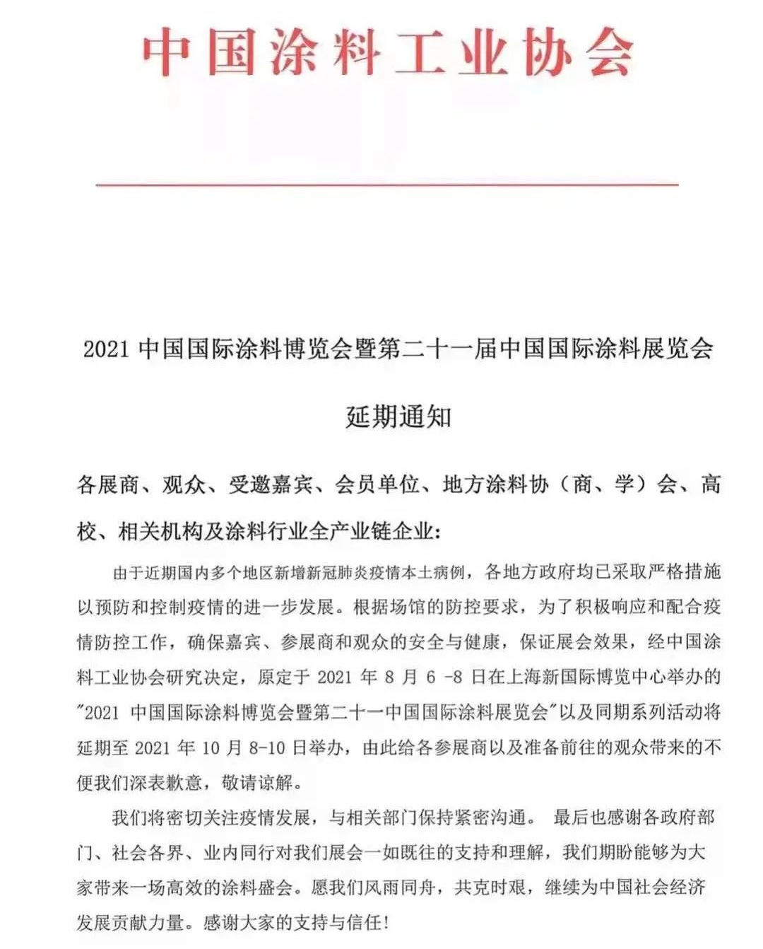 暨第二十一中国国际涂料展览会由于近期疫情防控原因,原定于2021年8月6-8日的上海新国际博览中心举办的"2021中国国际涂料博览会暨第二十一中国国际涂料展览会"将延期至2021年10月8-10日举办 。 8 2021亚洲热能科技