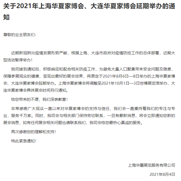 大连华夏家博会原定于2021年8月6日-8日举办的上海华夏家博会、大连华夏家博会延期举办。上海华夏家博会将调整至2021年10月1日—3日世博展览馆举办,大连华夏家博会具体展会时间另行通知。 5 第 32 届中国(上海)国际墙纸墙布窗帘
