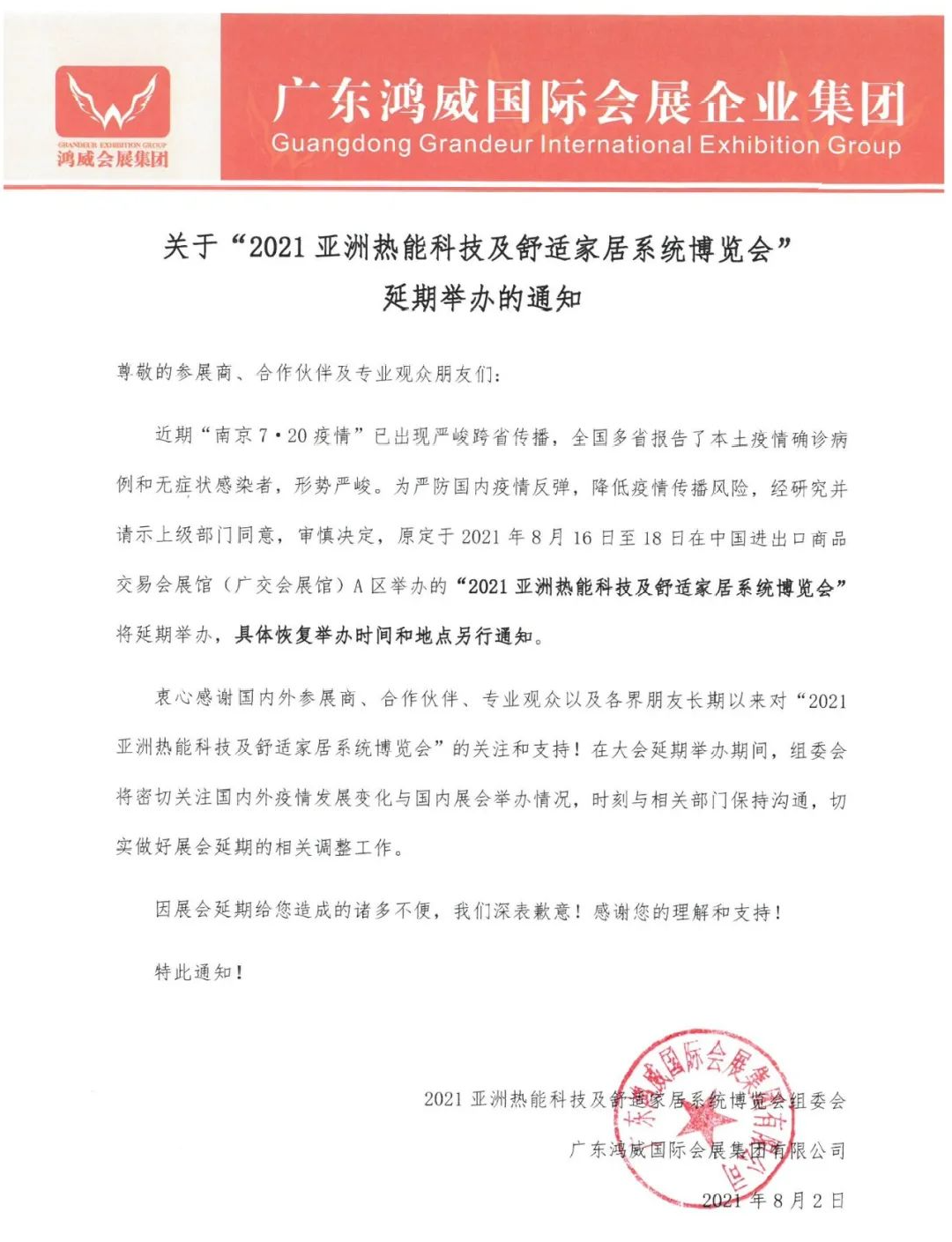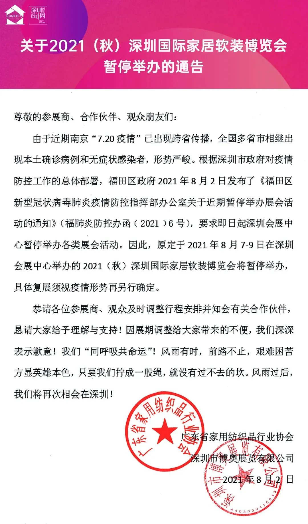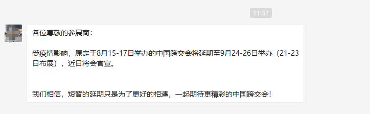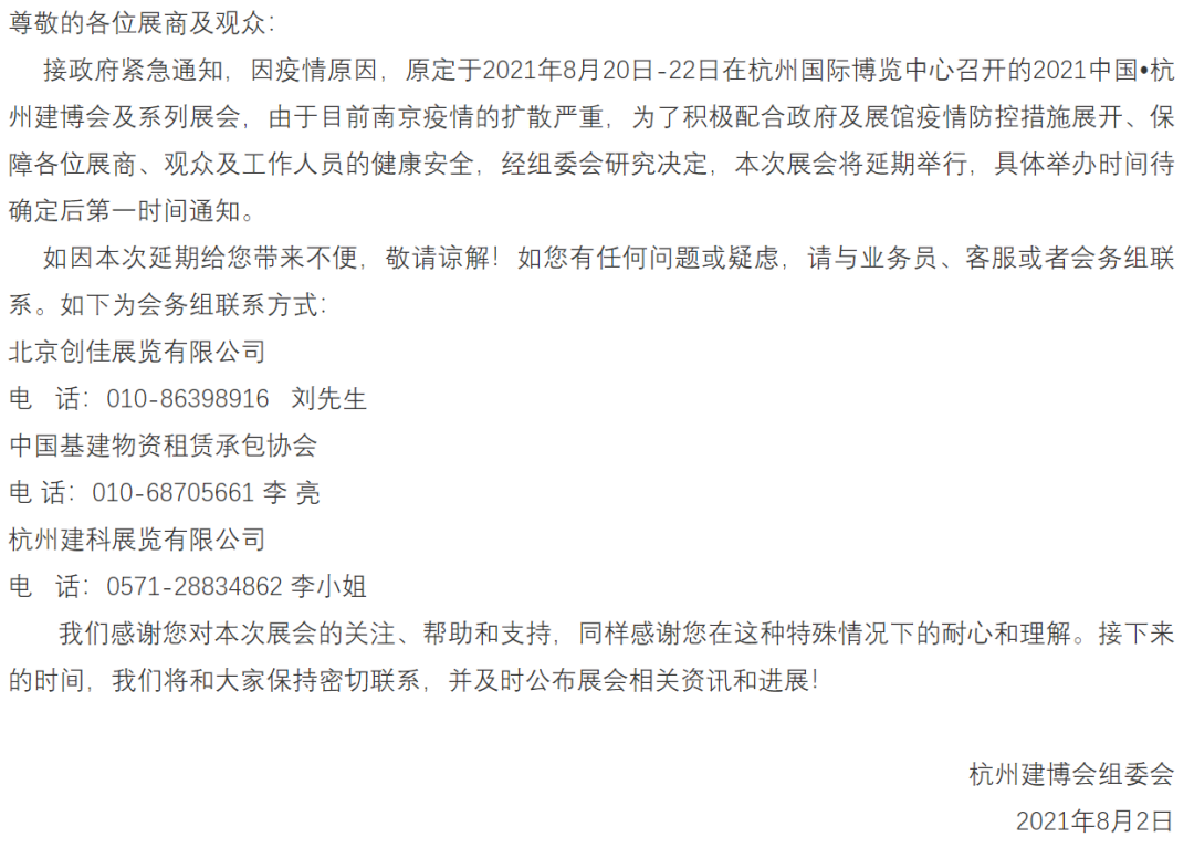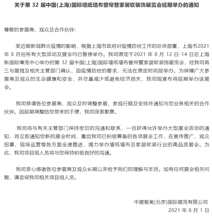 近期,南京“7.20疫情”已出现跨省传播,全国多省市相继出现本土确诊病例和无症状感染者,形势较为严峻。结合新冠疫情防控的有关要求,从保障参会人员健康安全的角度出发,全国多地已陆续发布8月展会延期公告。