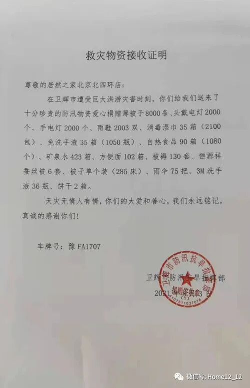 经与卫辉市副市长热线联系了解情况后,居然之家北京北四环店在第一时间将捐赠款项全部用于购买当地紧缺物资,其中包括8000条薄被、4000个照明用具、2003双雨靴、3150件日常消毒物资、90箱自热食品等。采购物资于8月3日连同商家所捐赠的褥子、食品、饮用水等爱心物资,在居然之家北京北四环店打包装车完毕,并于当晚23时12分出发,赶往卫辉。