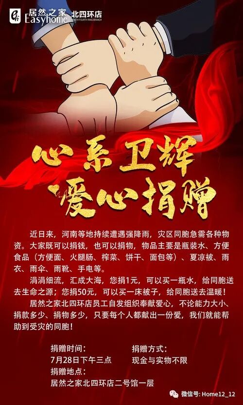 一方有难,八方支援,同胞一心。7月28日,居然之家北京北四环店向全体员工及在场商家发出募捐倡议,为河南卫辉助力加油。