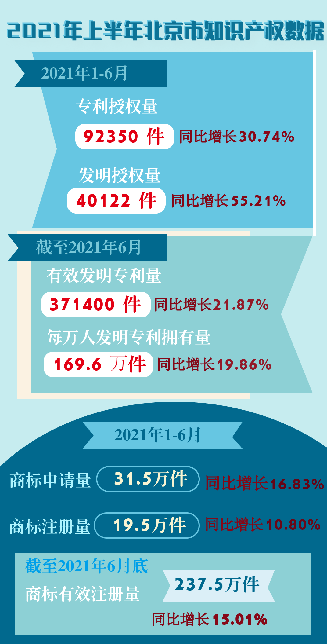 2021年1-6月,全市商标申请量31.5万件,同比增长16.83%,商标注册量19.5万件,同比增长10.80%;截至2021年6月底,商标有效注册量237.5万件,同比增长15.01%。