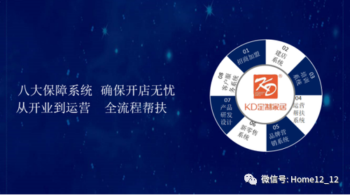 KD有确保经销商开店无忧的八大保障系统,分别是:招商加盟、建店系统、培训系统、运营帮扶系统、品牌营销系统、新零售系统、产品研发设计和客户服务系统。