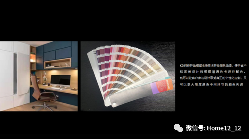 在此方面,KD定制家居坚持以人为本,对产品力的注重大于营销力——以设计为导向,去风格,多元化融合;坚持门墙柜一体化趋势,以全案取代全屋;进口品质国产化,将混油木皮、实木涂装应用到产品中。值得一提的是,KD定制家居还根据市场需求开放调色油漆,便于消费者和家装设计师根据潘通色卡进行配色,让消费者亲自参与设计,选择喜欢的色卡打造空间,享受真正的个性化定制。