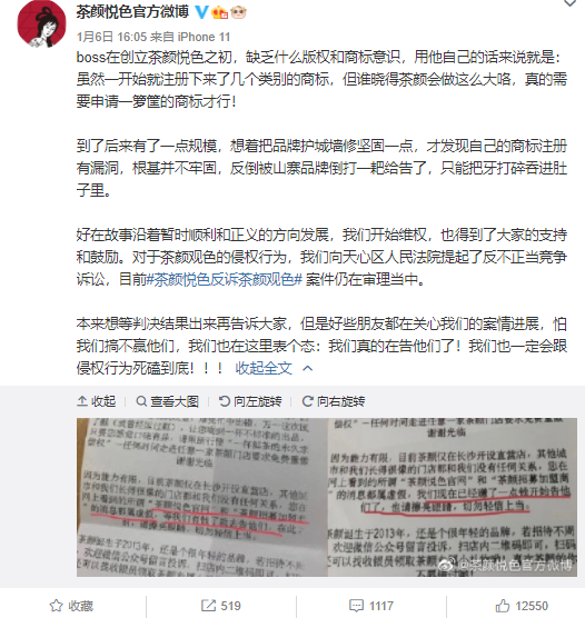 2021年1月4日,茶颜悦色起诉茶颜观色不正当竞争案,在湖南省长沙市天心区人民法院开庭。