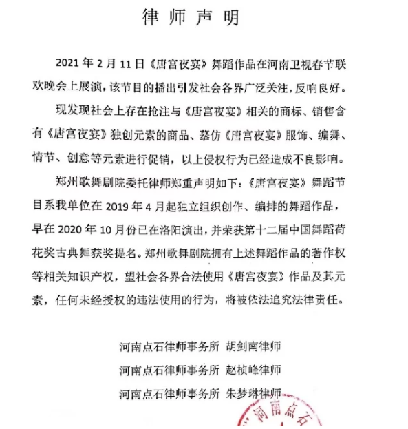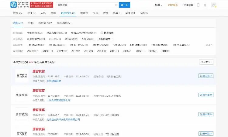 此前,郑州歌舞剧院编排的《唐宫夜宴》舞蹈作品展演后,引发社会各界广泛关注,反响良好。 4月9日,郑州歌舞剧院工作人员回应称,《唐宫夜宴》舞蹈节目是郑州歌舞剧院在2019年4月起独立组织创作编排的舞蹈作品。2020年10月在洛阳演出并荣获第十二届中国舞蹈荷花奖古典舞获奖提名,郑州歌舞剧院拥有上述舞蹈作品的著作权等相关知识产权,“因为这个知识产权和这个著作权是我们的,我们会向商标局去申诉,然后驳回其它那些不合适的。我们现在也聘请了律师,已发布律师声明。” 据了解,截至2021年4月9日,关于“唐宫夜宴”及类似商标共有422个,涉及餐饮、娱乐、酒店、文旅、住宿等多个行业类别。 05
