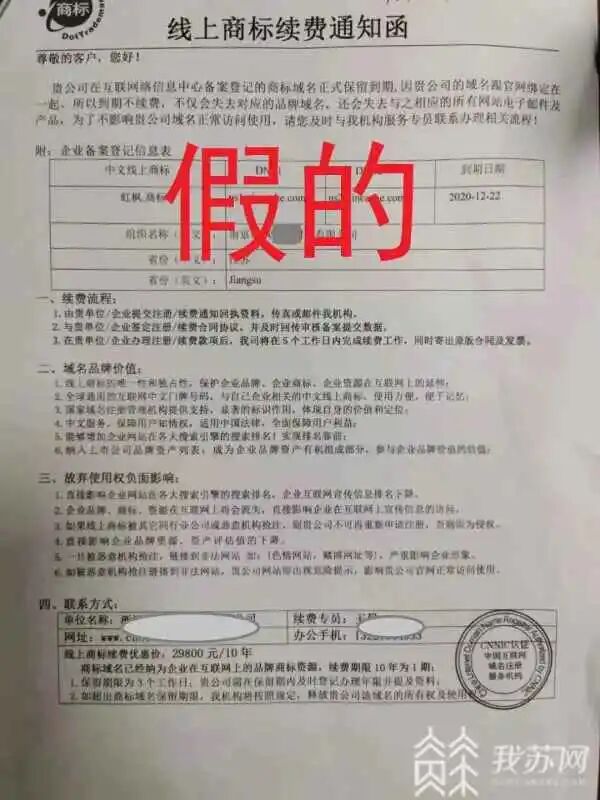 记者12月29日从南京市高淳区市场监管局获悉,近日,高淳区市场监管局接到一商标申请人的咨询,称其收到一张“线上商标续费通知函”,上面写有“贵公司在互联网络信息中心备案登记的商标域名正式保留到期,因贵公司的域名跟官网绑定在一起,所以到期不续费,不仅会失去对应的品牌域名,还会失去与之相应的所有网站电子邮件及产品,为了不影响贵公司域名正常访问使用,请您及时与我机构服务专员联系办理相关流程!”字样,并且还附有申请人商标的相关信息,及续费流程、域名品牌价值、放弃使用权负面影响和联系方式等内容。