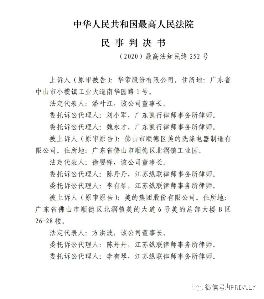 IPRdaily消息:近日,据IPRdaily记者了解,美的诉华帝专利纠纷案件有了新的判决产生。最高人民法院终审判决:驳回华帝的上诉请求,维持南京市中级人民法院在2019年11月做出的一审判决,判令华帝立即停止生产、销售、许诺销售侵害美的ZL201320169306.0号“洗碗机防溢流结构及洗碗机”实用新型专利权的洗碗机产品,并赔偿美的60万元。