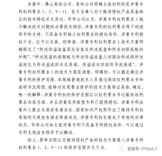而近日,据IPRdaily记者了解,佛山市顺德区美的洗涤电器制造有限公司(以下简称“美的”)诉华帝股份有限公司(以下简称“华帝”)专利纠纷案件又有了新的判决产生。最高人民法院终审判决:驳回华帝的上诉请求,维持南京市中级人民法院在2019年11月做出的一审判决,判令华帝立即停止生产、销售、许诺销售侵害美的ZL201320169306.0号“洗碗机防溢流结构及洗碗机”实用新型专利权的洗碗机产品,并赔偿美的60万元。华帝再次被判构成专利侵权,美的再次胜诉,华帝洗碗机再度被贴“侵权”标签。