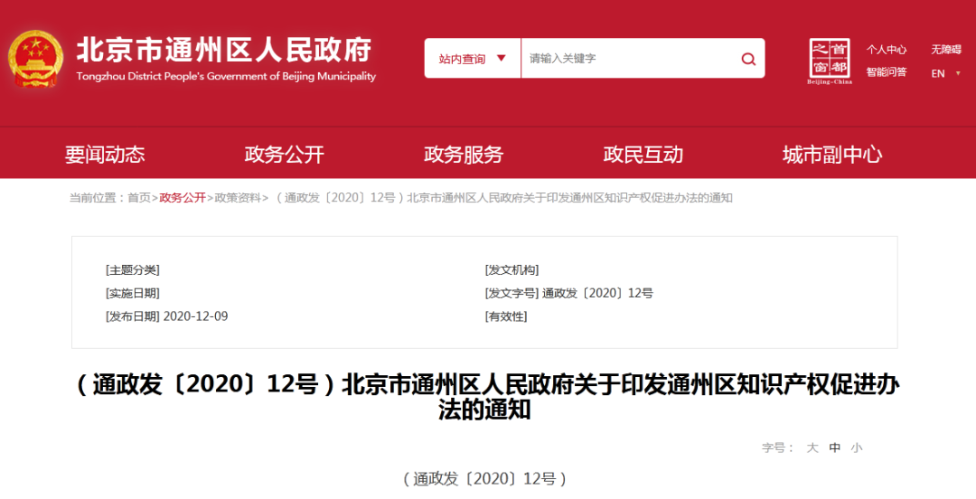 (通政发〔2020〕12号)北京市通州区人民政府关于印发通州区知识产权促进办法的通知