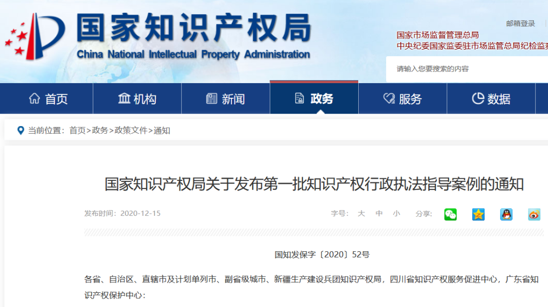 原标题:国家知识产权局关于发布第一批知识产权行政执法指导案例的通知