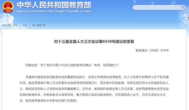 原标题:将发明专利纳入高考加分项目?教育部答复:减少和规范中高考加分项目,促进教育公平