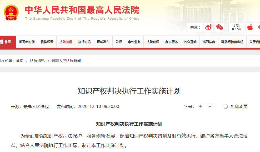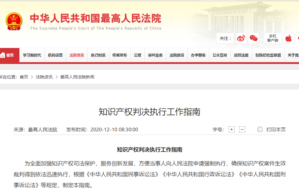 #本文仅代表作者观点,不代表IPRdaily立场# 原标题:最高院发布知识产权判决执行工作指南及实施计划! IPRdaily消息:近日,最高院发布《知识产权判决执行工作指南》及《知识产权判决执行工作实施计划》。