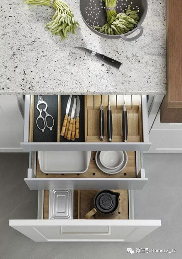 其次是功能配件是否符合人体工程学。我们的建议是:采用功能件,存取物品时尽量不用弯腰。其次是采用推弹抽屉滑轨,开关抽屉,也可以实现无需弯腰。