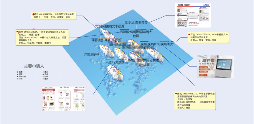 智能推荐技术是以建立不同使用场景的推荐机制,实现推荐引擎从传统的大众化推荐向差异化推荐转变,并最终实现基于用户偏好的个性化推荐。智能推荐可以基于用户的喜好关联,从而针对性的将产品和服务向用户推荐。随着人工智能应用的发展,智能推荐技术也出现了巨大飞跃,当前研究的主要分支技术有时频及视频片段、云端服务器及推送消息、兴趣及行为数据、推荐信息及推送信息、协同过滤推荐及图书推荐等领域,这些领域的技术发展产出了大量专利成果,专利成果的产业化应用如百度中文搜索引擎,成为了网民上网的重要入口和内容消费平台。