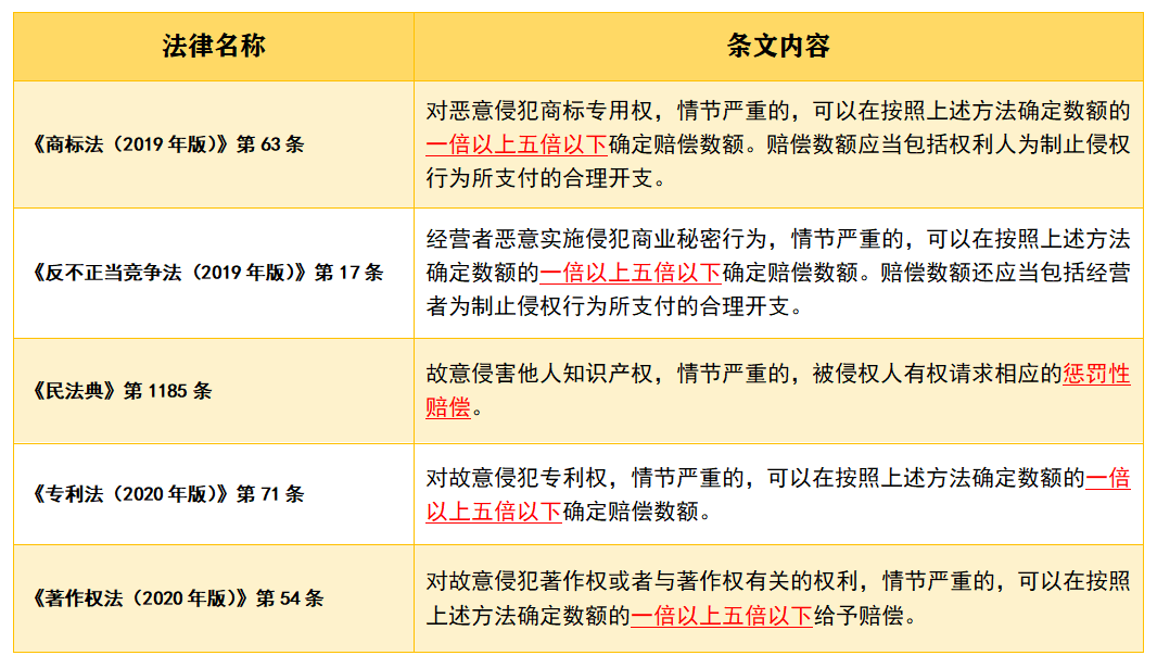 著作权法修正案规定,“对故意侵犯著作权或者与著作权有关的权利,情节严重的,可以在按照上述方法确定数额的一倍以上五倍以下给予赔偿。”著作权法中增加惩罚性赔偿制度意味着,在知识产权领域惩罚性赔偿制度已经较为全面的建立(见下图)。