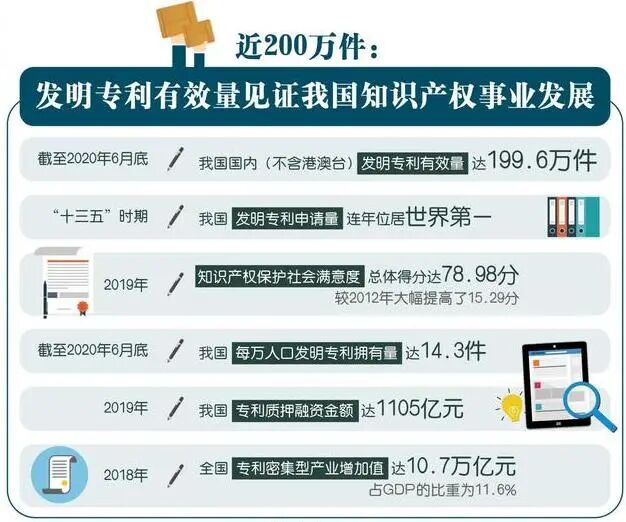 截至2020年6月底,我国国内(不含港澳台)发明专利有效量达199.6万件。“十三五”时期,我国发明专利申请量连年位居世界第一,创新活力持续迸发的背后,是我国知识产权创造、保护、运用等“全链条”的全面跃升。