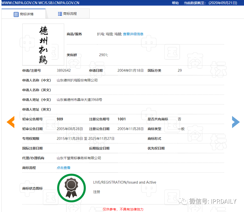 据了解,山东德州扒鸡集团有限公司于2005年11月28日申请注册了第3892642号“德州扒鸡”商标。2013年10月14日,将该商标转让给德州扒鸡公司。核准使用商品为第29类:扒鸡、鸡翅、鸡腿。