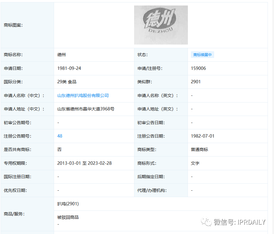 最早于1982年申请了第159006号“德州”商标,申请类别为第29类,主要用于食品。