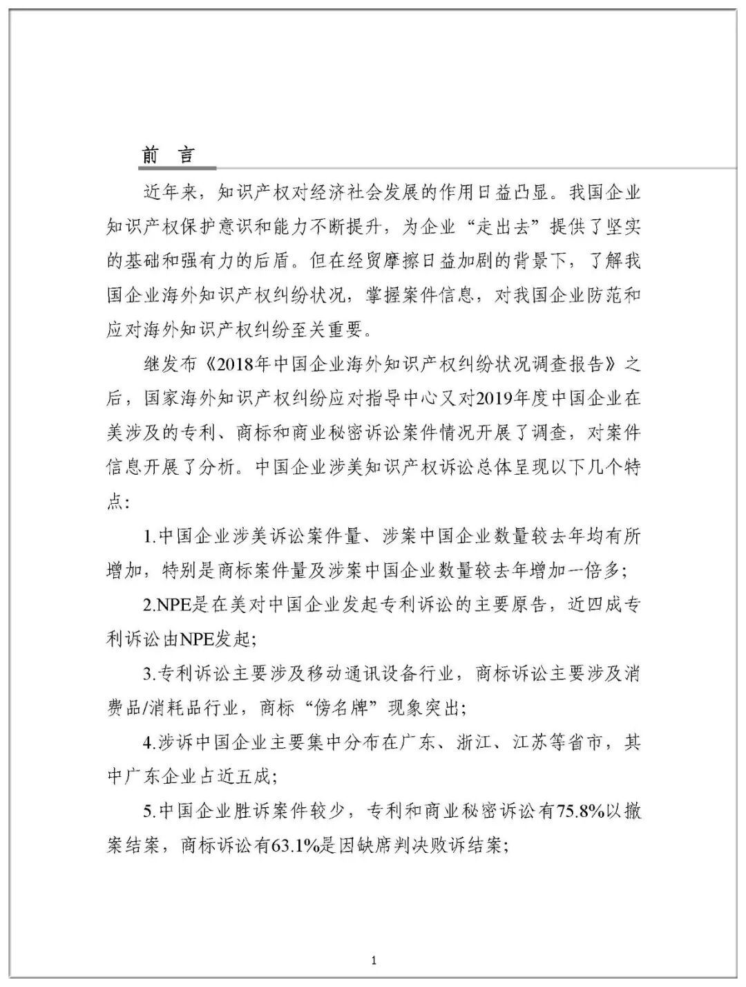 编者按:近年来,知识产权对经济社会发展的作用日益凸显。在经贸摩擦日益加剧的背景下,了解我国企业海外知识产权纠纷状况,掌握案件信息,对我国企业防范和应对海外知识产权纠纷至关重要。国家海外知识产权纠纷应对指导中心组织专家队伍对2019年中国企业涉美知识产权诉讼情况开展了调查研究,以期为国内企业提供参考。