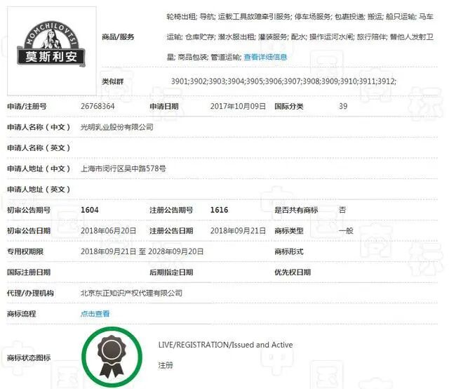 据了解2008年以来光明乳业在29类、32类等商品类别上申请注册了“莫斯利安MOMCHILOVTSI及图”商标。