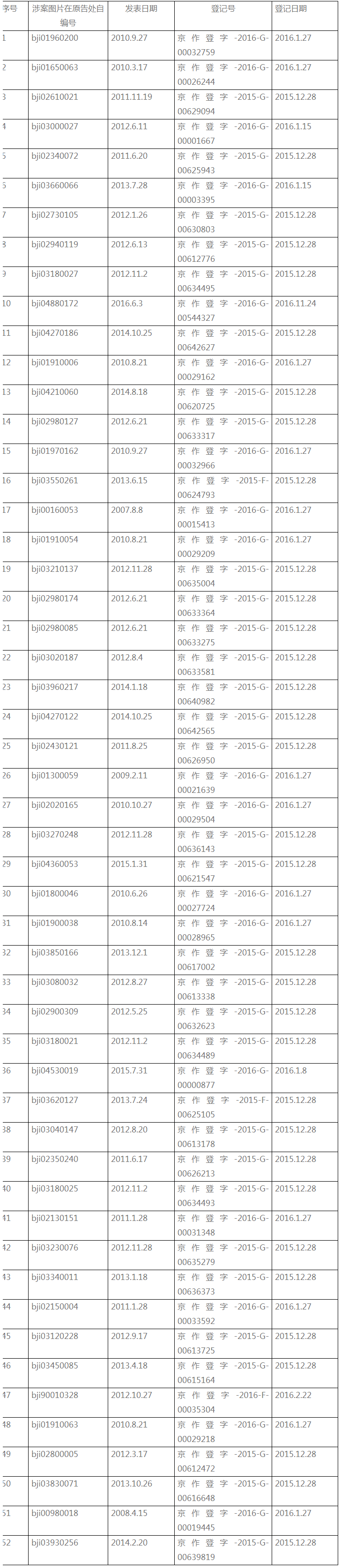 涉案图片共52张,原告将涉案图片在北京市版权局进行了作品自愿登记,并获得了《作品登记证书》,详情见附表。