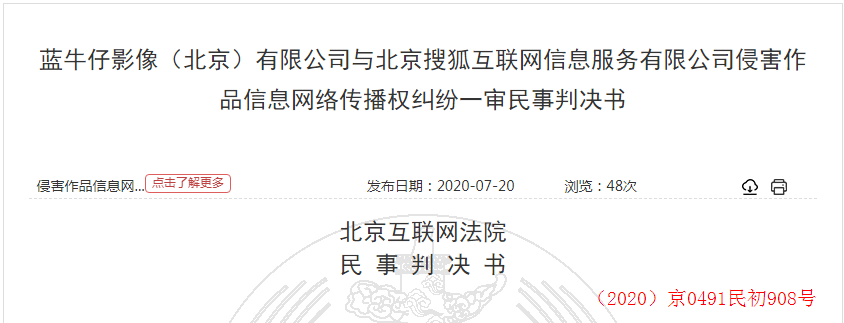 北京互联网法院审理认为搜狐公司未经许可,在其主办的网站上使用涉案图片,侵犯了原告对涉案图片所享有的信息网络传播权,应承担相应的侵权责任。2020年4月11日一审判处搜狐公司赔偿原告蓝牛仔影像(北京)有限公司经济损失36400元及维权合理费用5000元,同时负担案件受理费400元。