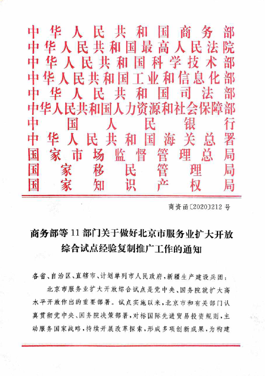 近日,商务部等11部门印发《关于做好北京市服务业扩大开放综合试点经验复制推广工作的通知》(商资函〔2020〕212号),向全国复制推广北京市服务业扩大开放综合试点经验。“知识产权纠纷多元化调解机制”成为6项复制推广事项之一,主要内容为“推动成立一批行业性专业性人民调解组织,积极构建知识产权部门牵头、司法行政部门指导、司法部门确认保障的多部门联动的知识产权矛盾纠纷多元化调解机制”。