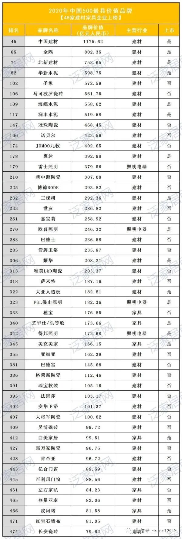 而在家具建材领域,有48家建材家具企业入榜2020年《中国500最具价值品牌》排行榜。其中家具企业上榜6家,分别是穗宝、芝华仕、美克美家、曲美家居、左右家私、皮阿诺,品牌价值分别为176.85亿元、173.66亿元、166.15亿元、99.51亿元、84.23亿元、81.58亿元;4家照明企业上榜,分别是雷士照明、欧普照明、FSL佛山照明、得邦照明,品牌价值分别为379.56亿元、246.32亿元、182.36亿元、172.68亿元;建材企业有38家,有中国建材、金隅、北新建材、华新水泥、圣象、马可波罗瓷砖、海螺水泥、润丰水泥、冠珠陶瓷、诺贝尔、九牧、惠达、新中源陶瓷、三棵树等等,其中中国建材品牌价值达1175.62亿元。